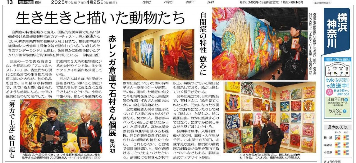 4月25日(金)東京新聞横浜神奈川版の朝刊で、 横浜赤レンガ倉庫での僕の個展を大きくとりあげてくれていました!! とってもうれしいです!! 今日も個展に在廊予定です。 みなさんとお会いするのを楽しみにしています!!