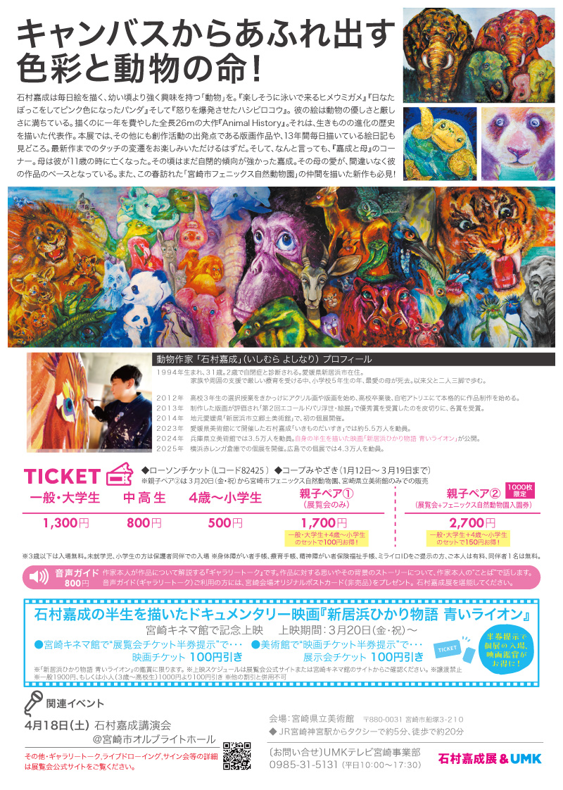 個展開催に伴い、3月20日(金・祝)より[宮崎キネマ館]で、石村嘉成の半生を描いたドキュメンタリー映画「新居浜ひかり物語 青いライオン」を上映こちらもぜひ、お楽しみください。